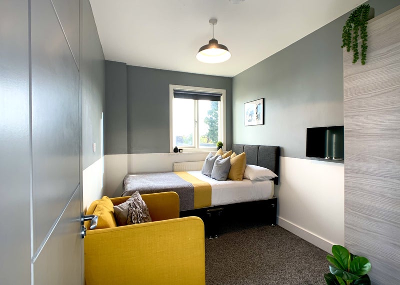 Inside the room, you'll find a comfortable double bed, double wardrobe, chest of drawers, and a smart TV.