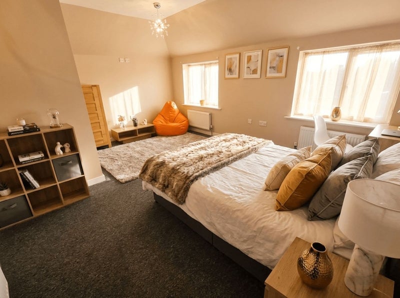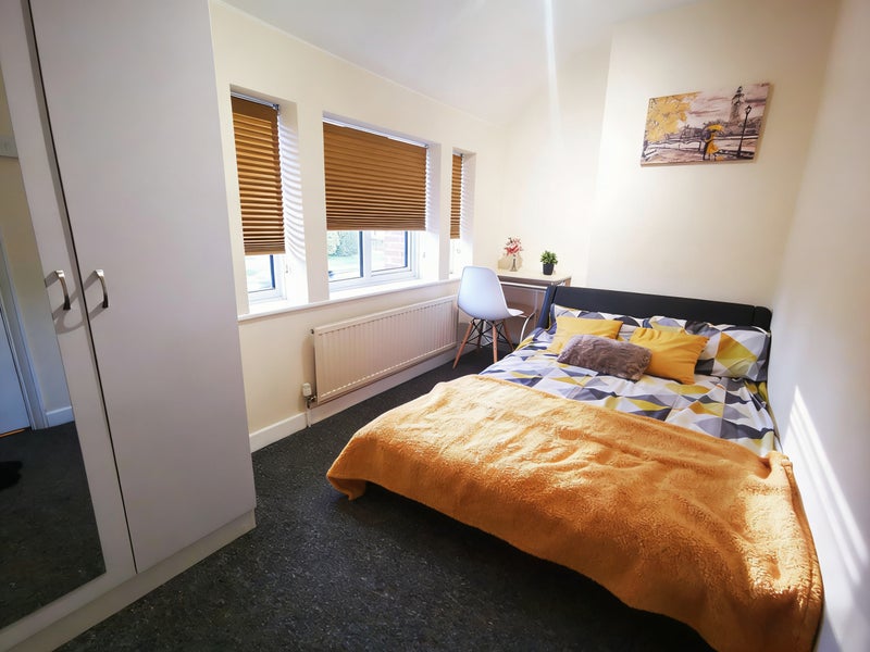 ----------------First floor very large ensuite double bedroom with double bed and mattress, 3 doors wardrobe, Storage unit, Chest drawers, TV cabinet, desk and chair, very decent size ensuite with modern taste. . £900 per calendar month (Bills included).