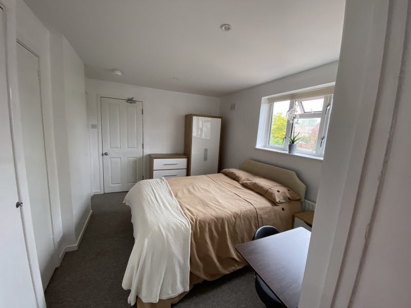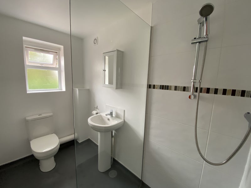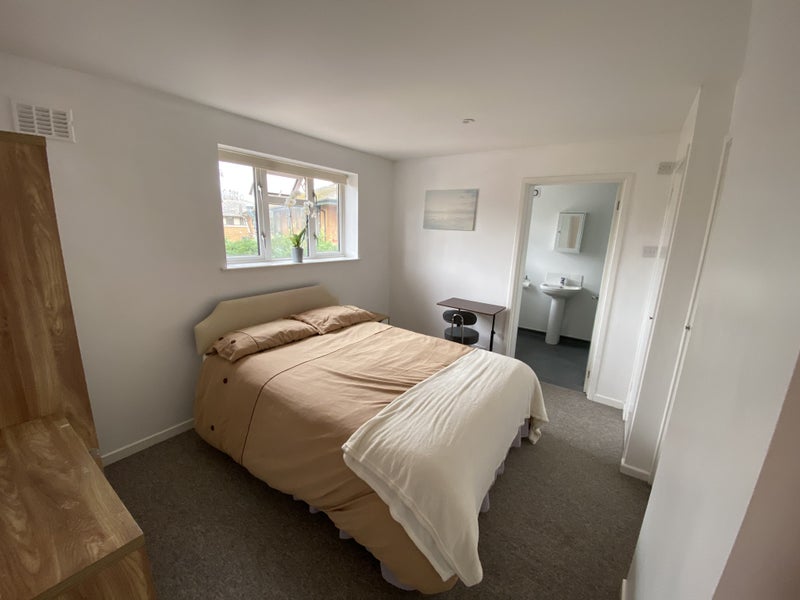 An upstairs double room is available, overlooking a peaceful enclosed rear garden. The room comes furnished with a double bed, wardrobe, chest of drawers, bedside cabinet, and has room for a desk, and chair. The private en-suite features a powerful shower.