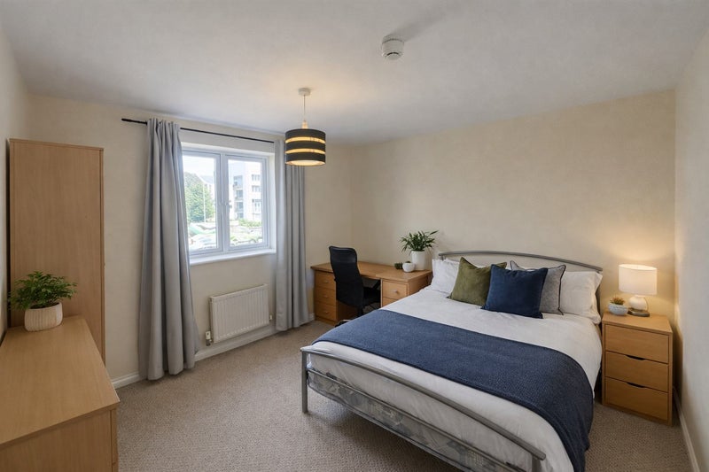 The room is furnished with a double bed, wardrobe, chest of drawers, desk & chair and 2 bedside tables.