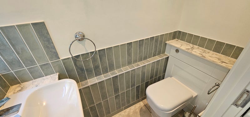A bright, larger than average kitchen diner with generous storage and fully equipped with microwave, oven, hob, fridge and freezer, dishwasher and washing machine for laundry.