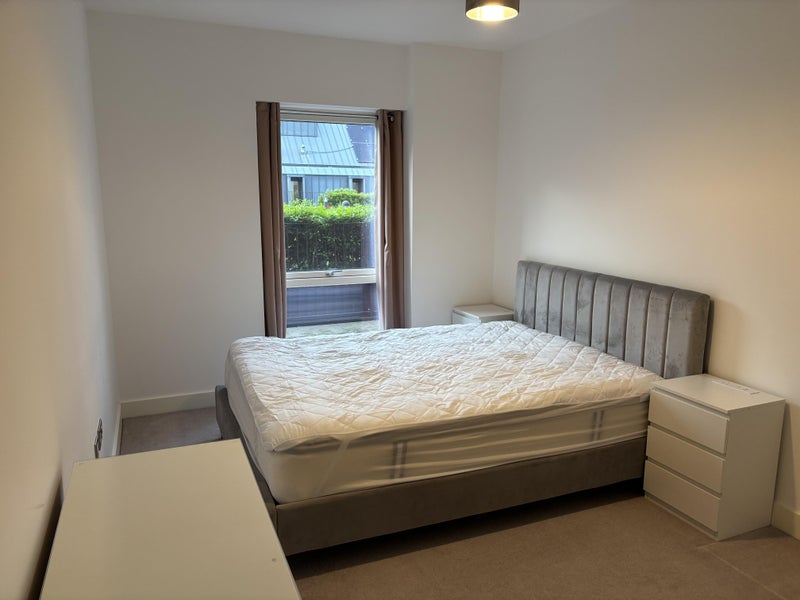 The room is a large master bedroom with Kingsize bed, two bedside tables, lamps, quadruple fitted wardrobe with hanging rails and drawers, dressing table and stool. The room has a floor to ceiling window overlooking a communal terrace garden.