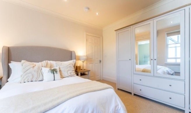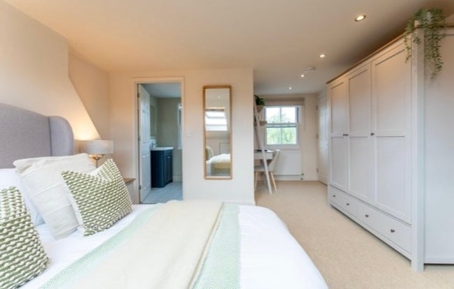 Bedroom 3, on the first floor of this stunning three-story Victorian villa off Victoria Road, reimagined into six stylish en-suite rooms. Featuring high ceilings, smart storage, and a spacious communal kitchen opening to a garden. All bills included; parking optional