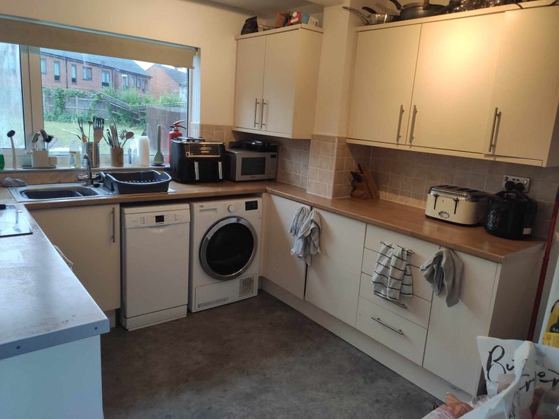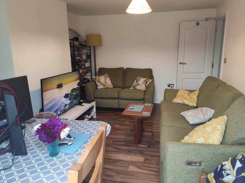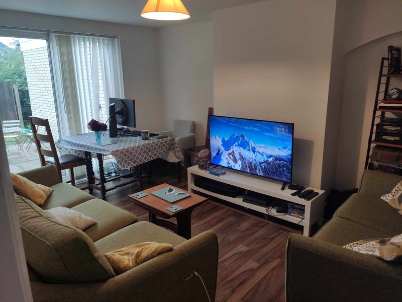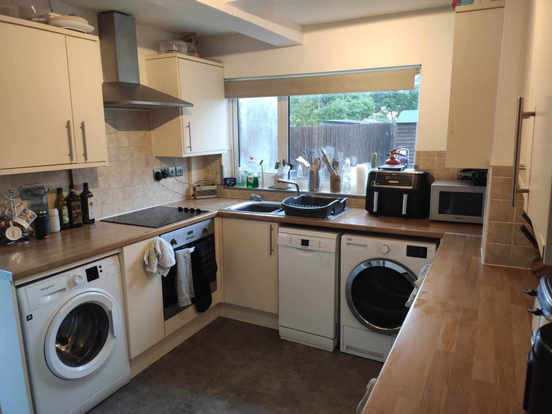 Communal kitchen and living room, two shared bathrooms and large garden (with shed for bike). Parking spaces and quiet road parking available. Washing machine, tumble drier, dishwasher and two fridges.