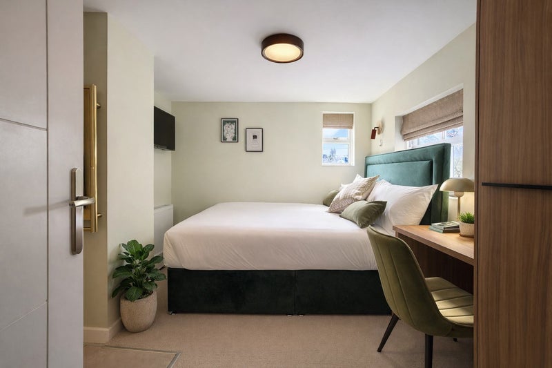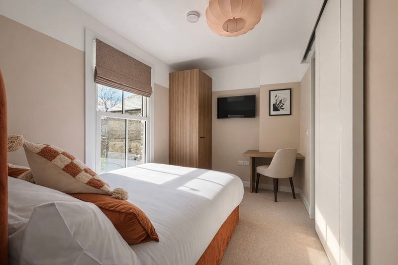There are six bedrooms in total, each with its own character, with front-facing rooms looking out towards the neighbouring church and the quiet rhythm of the street.