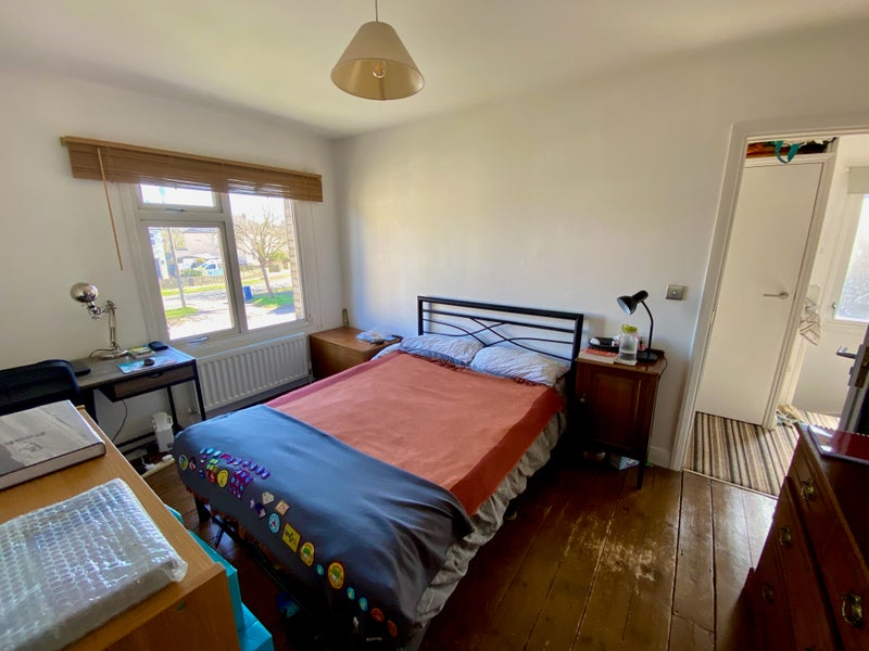 Spacious double bedroom furnished with double bed and wardrobe, in a 4 bedroom, 2-bathroom house. Communal kitchen and living room, plus a very large garden with shed for bike storage (and a croquet lawn!). Washing machine, tumble dryer, dishwasher, two fridges. Quiet parking available.