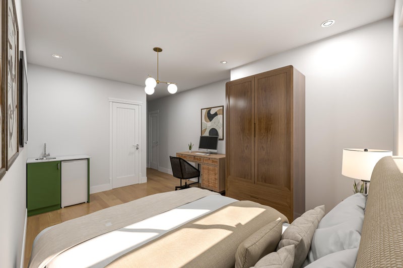 Generously sized top floor room with its own private entrance hallway, ideal for a coat rack and shoes, giving it a real apartment feel. Inside you have a double bed, desk and chair, an armchair and a smart TV. Mini kitchen with sink, fridge freezer and tea and coffee point. Large private ensuite with a bath and overhead shower.