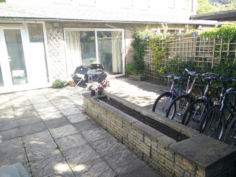 The good-size back patio is ideal for relaxing and sunbathing, with a low-maintenance back patio for bikes/bins: