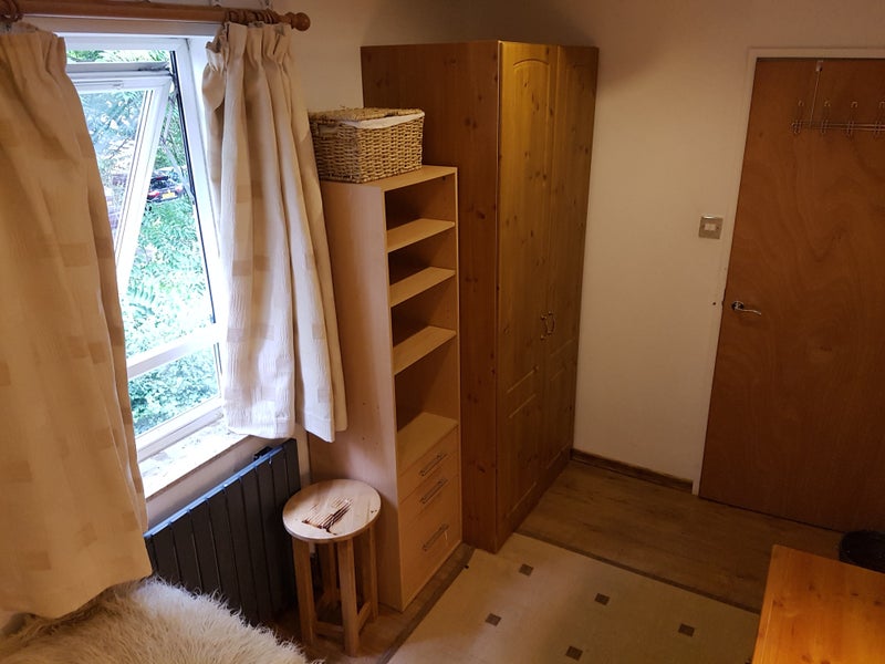The room is for single occupancy and has a small double bed, wardrobe and a chest of drawers.