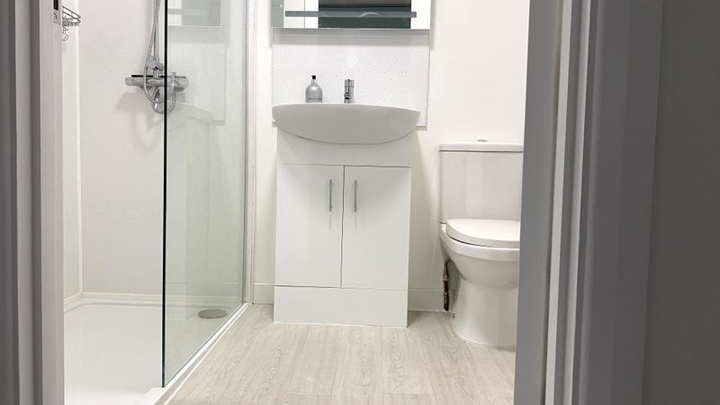 The bathroom has a walk-in shower with modern fittings, WC and basin.