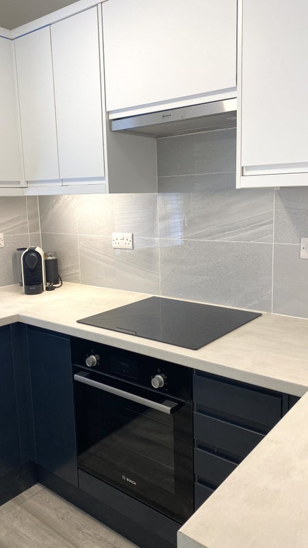 There’s a separate kitchen, which is sleek and well equipped with integrated appliances; washer-dryer, under-counter fridge-freezer, induction hob, oven, extractor fan with ample storage cupboards and worktop space.