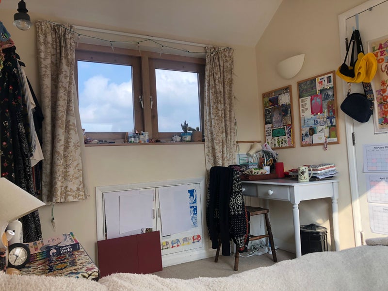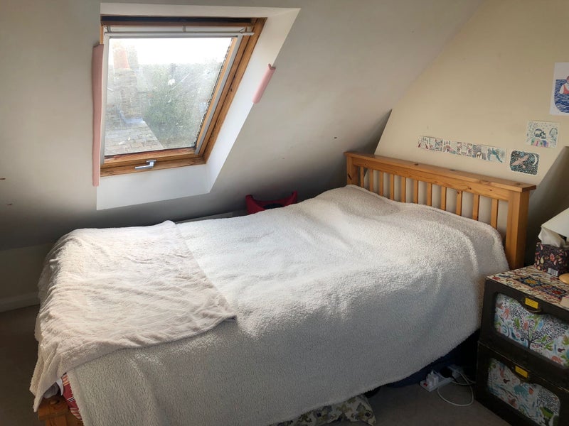 Double bed, some cupboard space available, desk, 1 large window and a skylight.