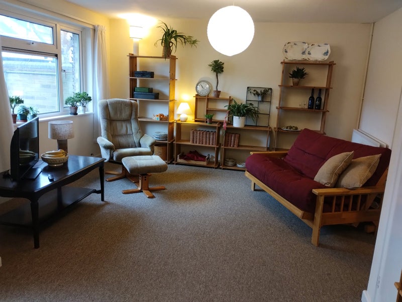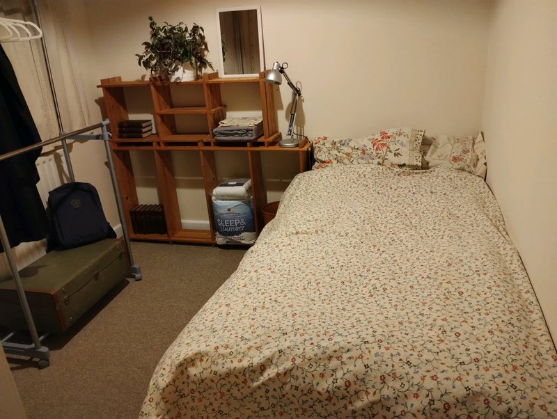 This is a single bedroom with drawers, hanging rail and small built in desk. Overlooking a quiet walkway in a peaceful back street in Cambridge city centre.