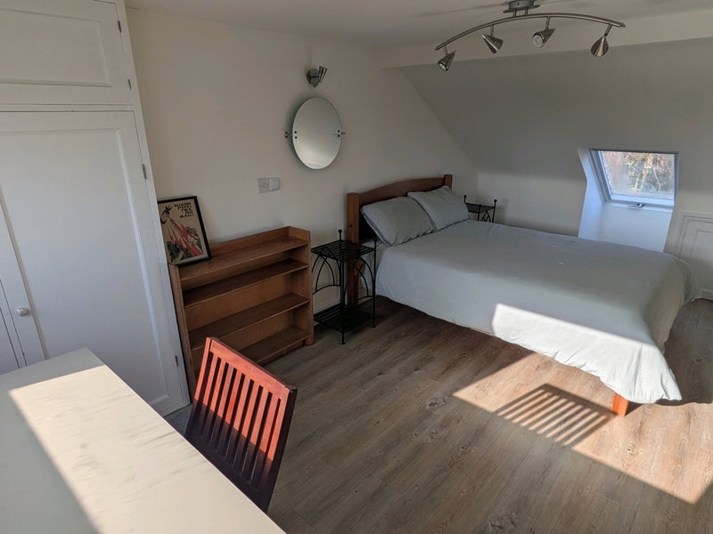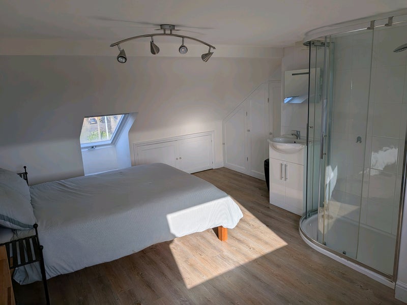 The bright and spacious bedroom has it's own shower and sink, a double bed, plenty of storage and a desk.