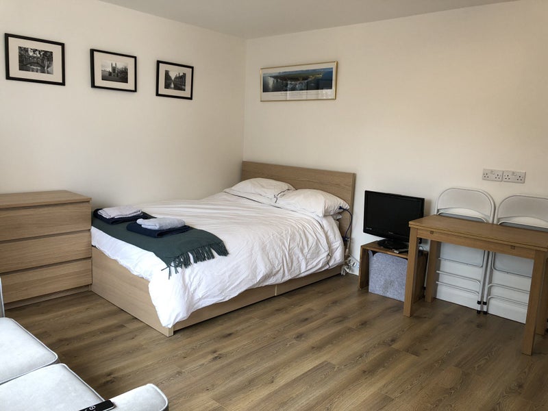 This is a refurbished 1 bed studio with en suite attached to our family home. The space has an oven, hob, dishwasher, fridge, microwave, toaster, and kettle.