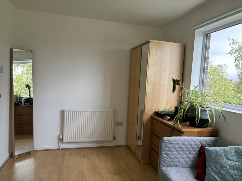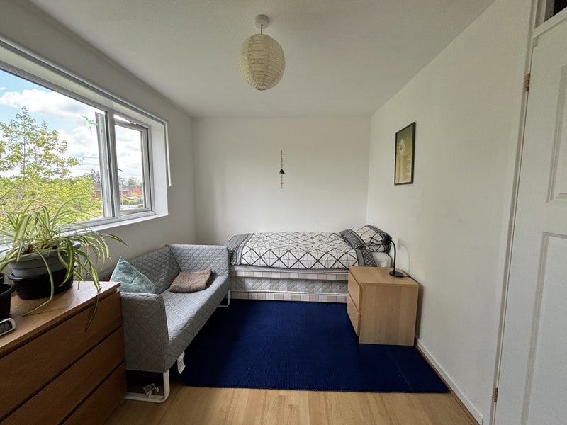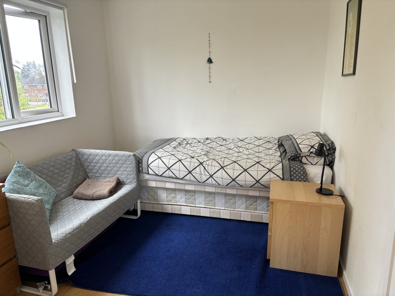 I have a furnished double room available in a warm and bright 4 bed house in Eaton Socon. It has a single bed, chest of drawers, wardrobe, bedside cabinet and a little sofa. The rest of the house is shared; kitchen/dining area, bathroom and garden with patio