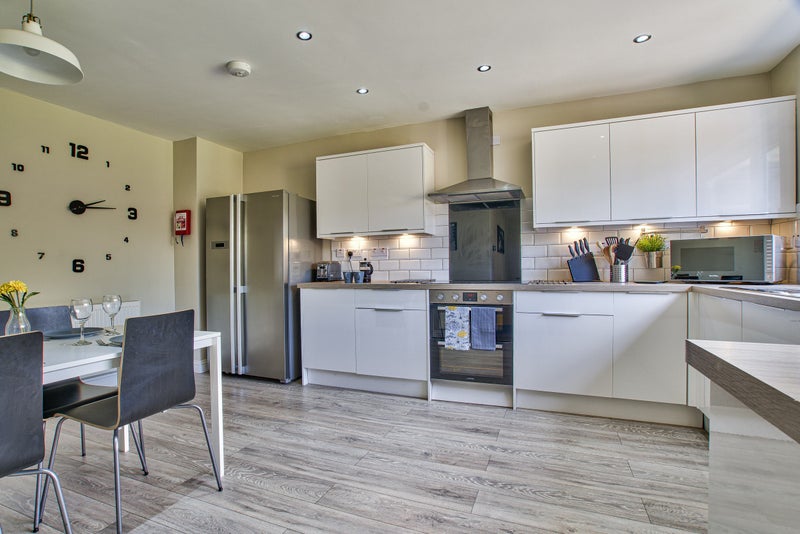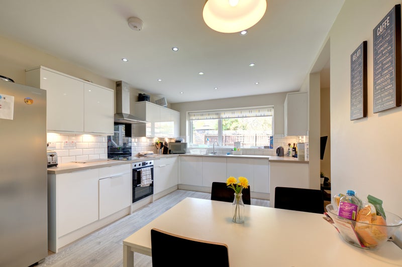 Fantastic well equipped large kitchen with seating area, including double oven and electric hob, large American style fridge/freezer, combi-microwave and dishwasher. Leading to a fully furnished communal living area with TV. Bright conservatory with access to large garden.