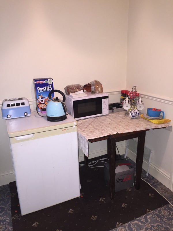 The room and that of another lodger are accessed via their own staircase and benefit from sharing their own Jack n Jill bathroom. On the landing of this staircase, there is a convenient breakfast area consisting of a fridge, toaster, kettle and microwave.