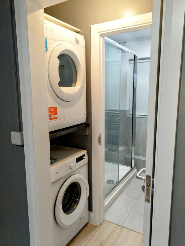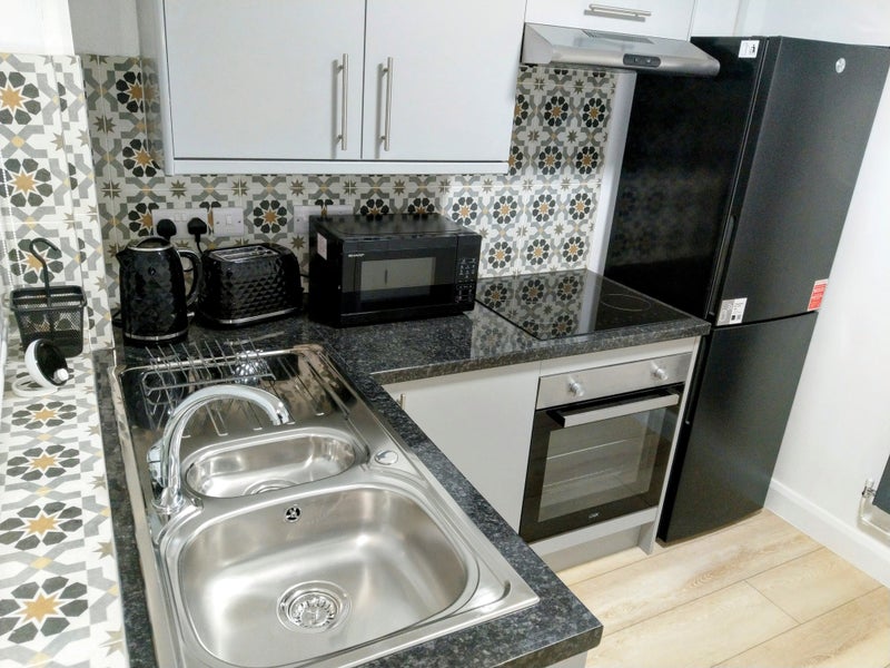 Large capacity tumble dryer, large capacity washing machine, ironing board and iron within utility area. Modern bathroom with large shower, floating toilet and sink. Main kitchen with fridge/freezer, hob, oven, grill, microwave, toaster, kettle and utensils included. Also, an extra cloakroom toilet with built in sink.