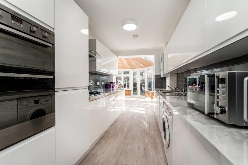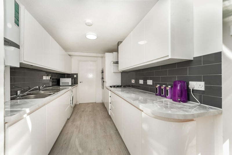 The kitchen is shared with three housemates. It is fitted with built in fridge/freezer, oven, hob, extractor hood and plenty of storage cupboards.