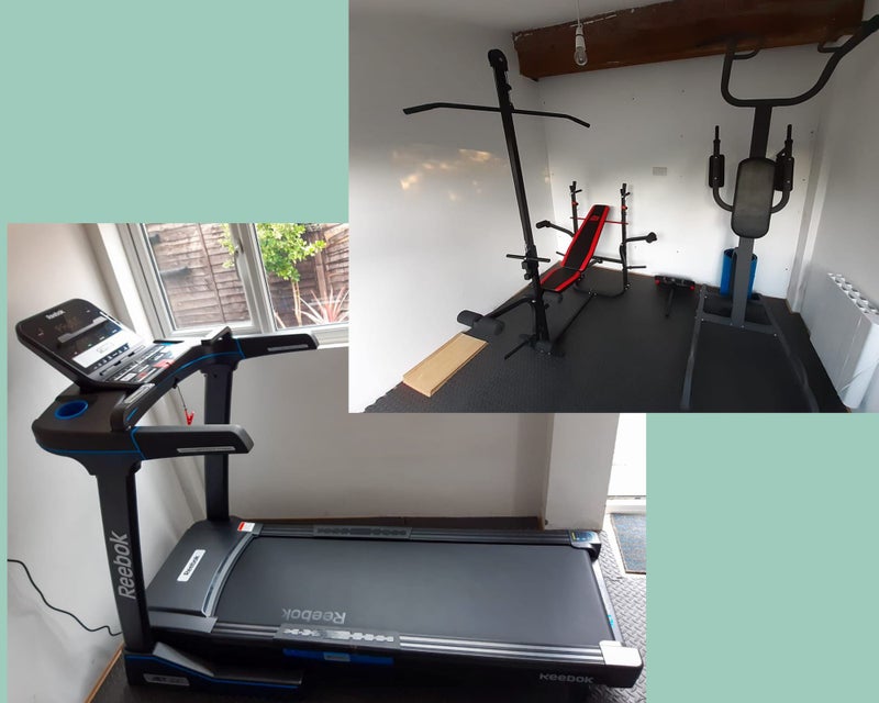 Shared dining-living room and a gym in the garden with tumble dryer.