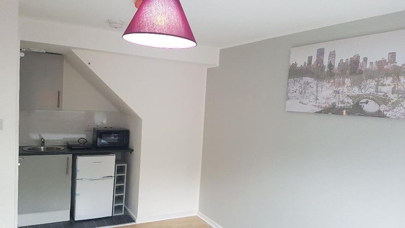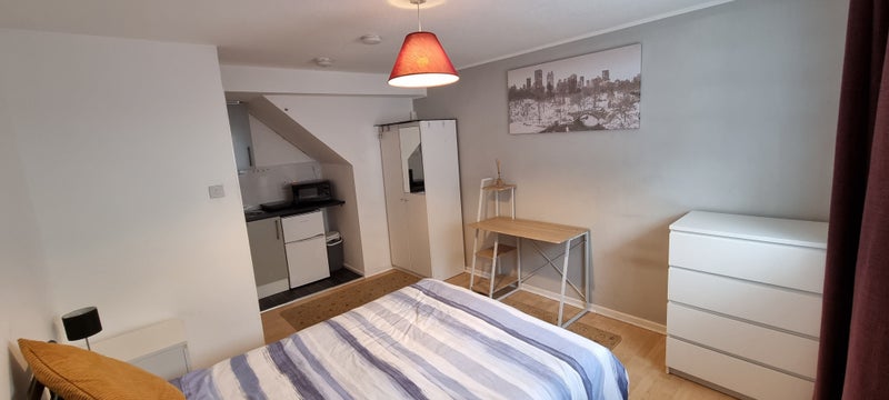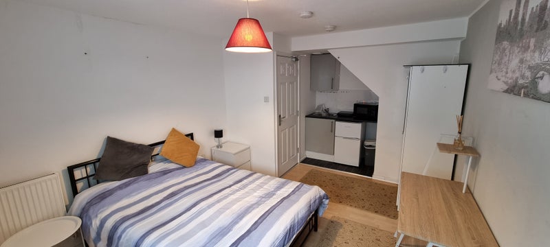 Self-contained Studio room with Mini kitchen(own Fridge/Freezer, microwave and a hotplate) in a shared house. There is an opportunity to rent a storage room (lockable) for additional £30pm.