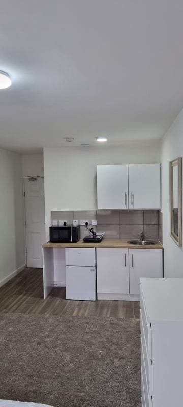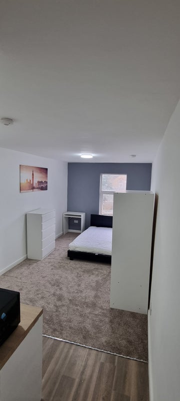 Studio room is spacious fully furnished with brand new bed/mattress, wardrobe, chest of drawers, Desk and a bedside table. Wall and base units provide plenty of storage. Wired LAN connection for each room, USB charging and shaver charging point in the shower too.