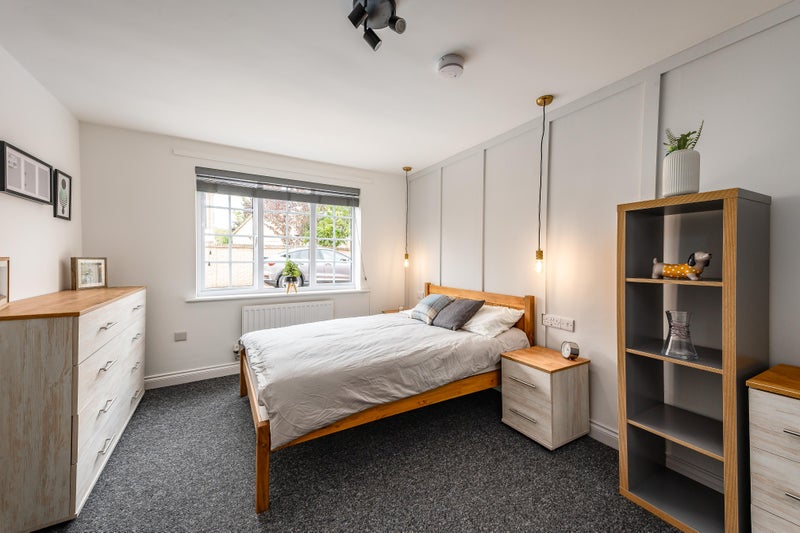Tastefully presented double bedroom, fully furnished (double bed, bedside tables, desk, mirrored wardrobe with chest of drawers). A desk can be provided if one is not already in the room to help you work from home. All the furniture is on wheels making it easy for tenants to rearrange the room if they wish to. Fresh carpets, modern furniture, loads of light and featured coloured walls giving the room a luxury and contemporary feel.