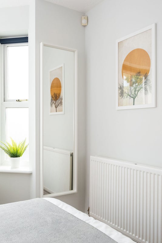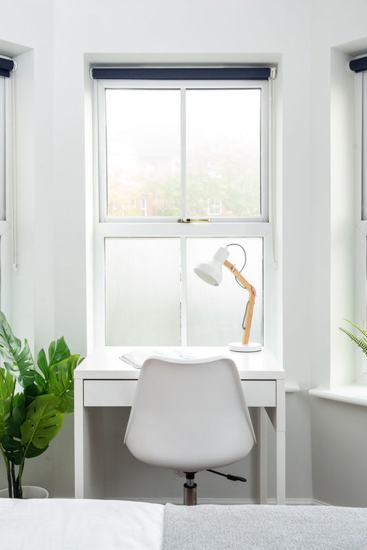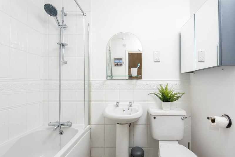 This large double room is furnished with a double bed and mattress, a built in wardrobe, a chest of drawers, desk and armchair. The room has a modern en-suite fully equipped with three piece suite mirror and fittings. Downstairs, there is a modern communal kitchen area with fridge/freezer, washing machine, dishwasher, dining table and separate w/c.