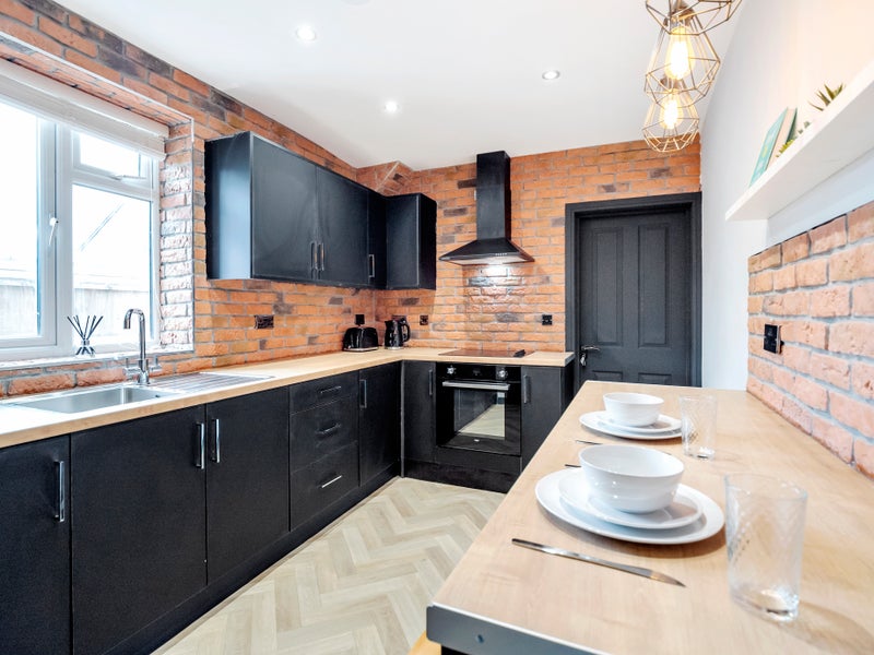 - USB socket & light switches conveniently located above to control the LED spotlights & industrial-style drop pendant lighting 💡, plus stunning laser-cut metal artwork 🖼️