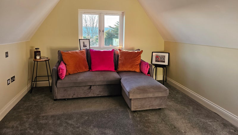 Large bedroom with modern ensuite (currently pictured with grey sofabed which will be moved to accommodate bed).