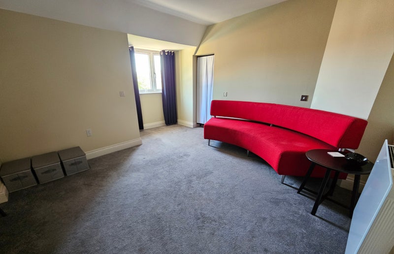 Separate private livingroom with large red sofa, side table, chest of drawers and tv provided. Space for dining area.