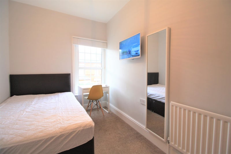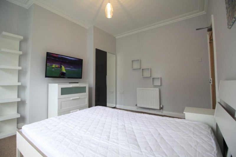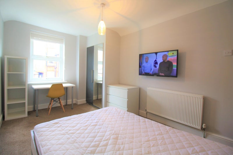 Large fully furnished double bedrooms with double glazing, blinds/curtains, wardrobe, desk, chair, shelf unit, double bed, bedside table and wall-mounted TVs. 2 shared toilet/shower rooms, living room and large kitchen, back yard, on street parking.