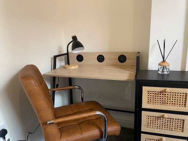 Fully furnished with double bed, wardrobe, chest of drawers, side table. Plenty of sockets & a TV point in each room.