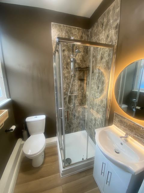 Luxury ensuite with shower, WC, basin, towel rail, lit mirror