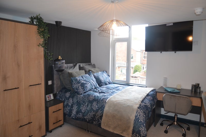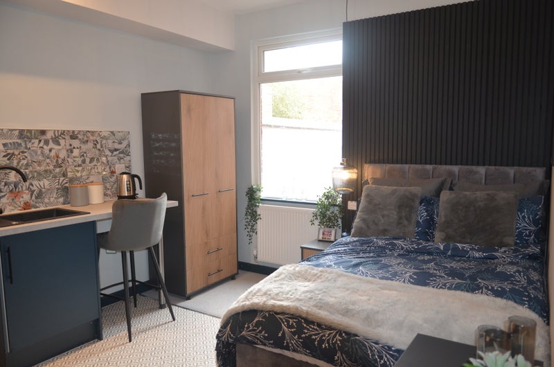 🛏️ Bright, stylish spaces with a double bed, wardrobe, chest of drawers, desk or breakfast bar, bedside table AND a Smart TV (including Netflix) - everything you need to move straight in.