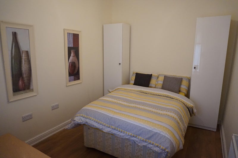Large double bedroom fully furnished with double bed, wardrobe, desk and bedside table.