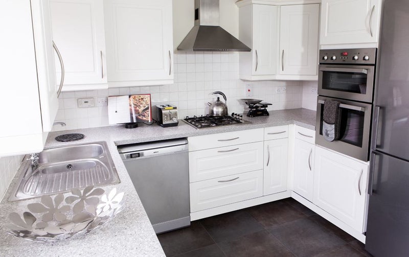 The large kitchen is fully equipped with good cupboard space, dishwasher and large fridge freezer as well as a dining area.