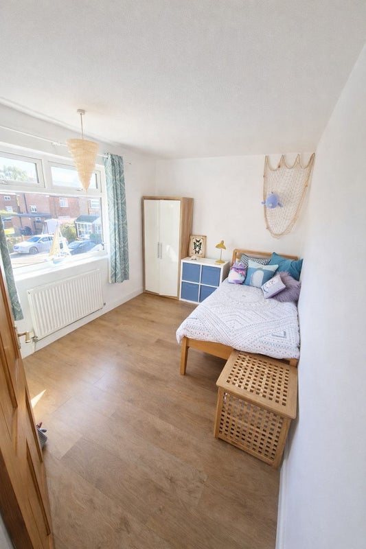 The room is a small double currently set up with a single bed and includes furniture for storage. The house has a shared kitchen, bathroom, living space and garden.