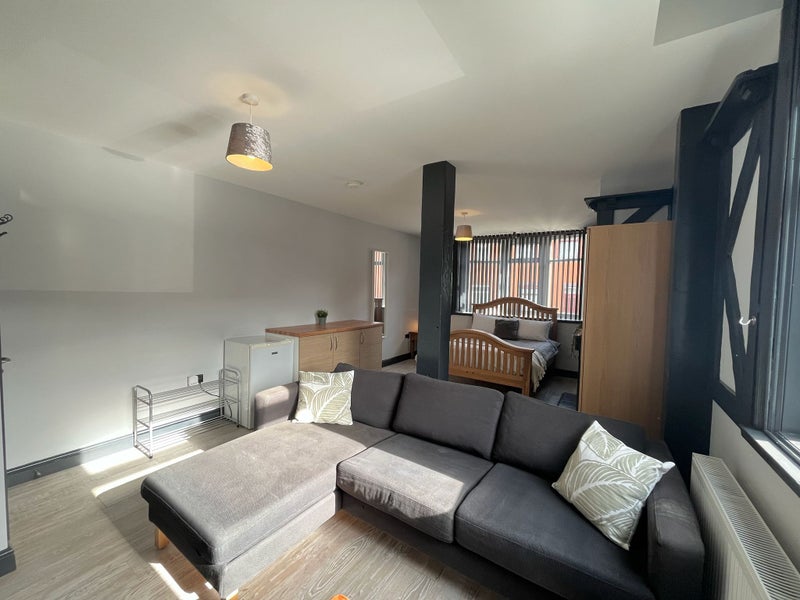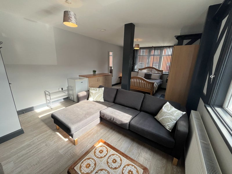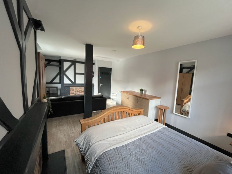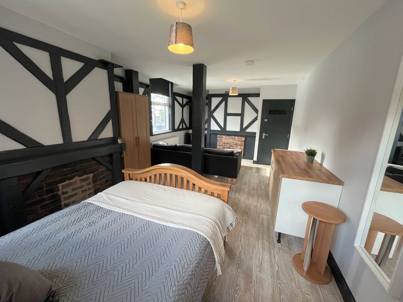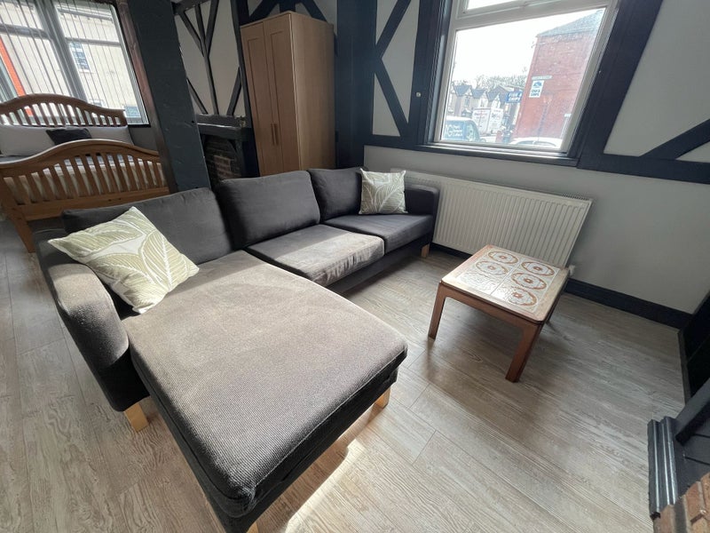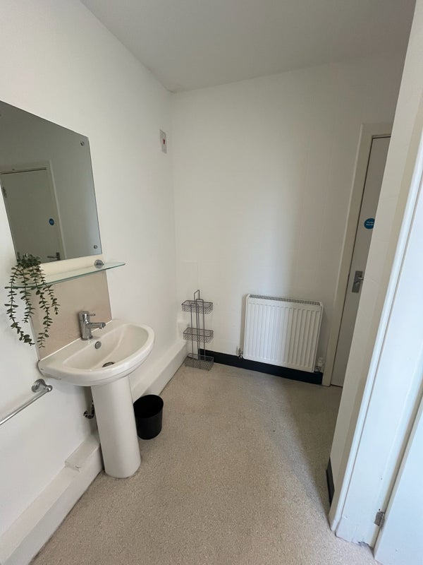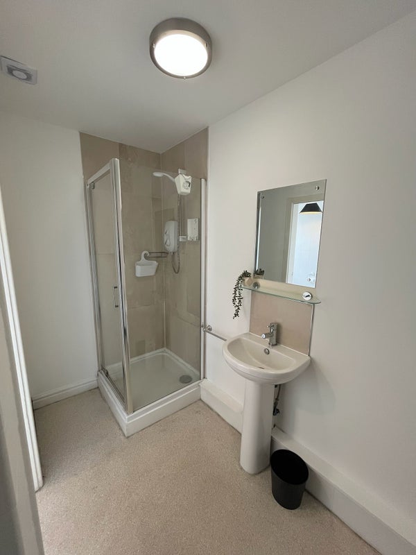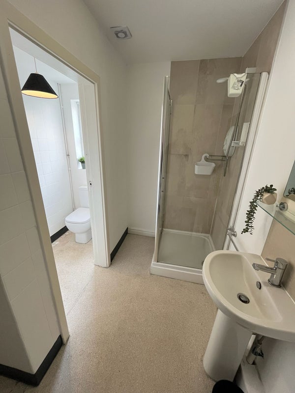 In this quiet and well managed house share the large Bedroom is fully furnished with a double bed, sofa, coffee table, tv unit, wardrobe, kitchen cupboards, fridge and has a private off-suite shower room with toilet across the hall.