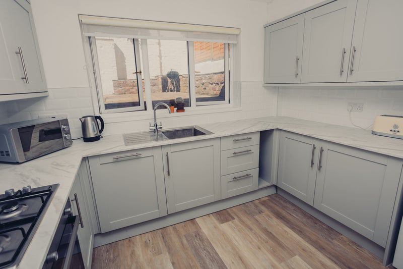 Modern kitchen, flooring, carpets, and bedroom furniture.