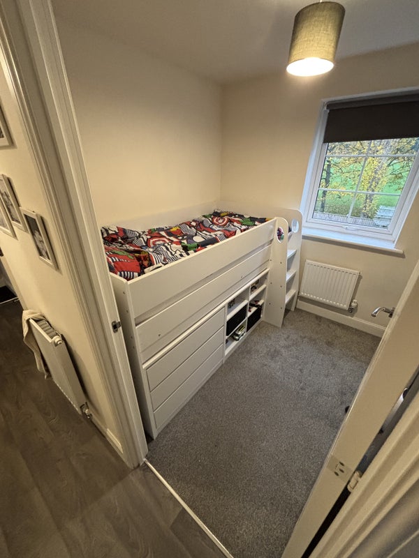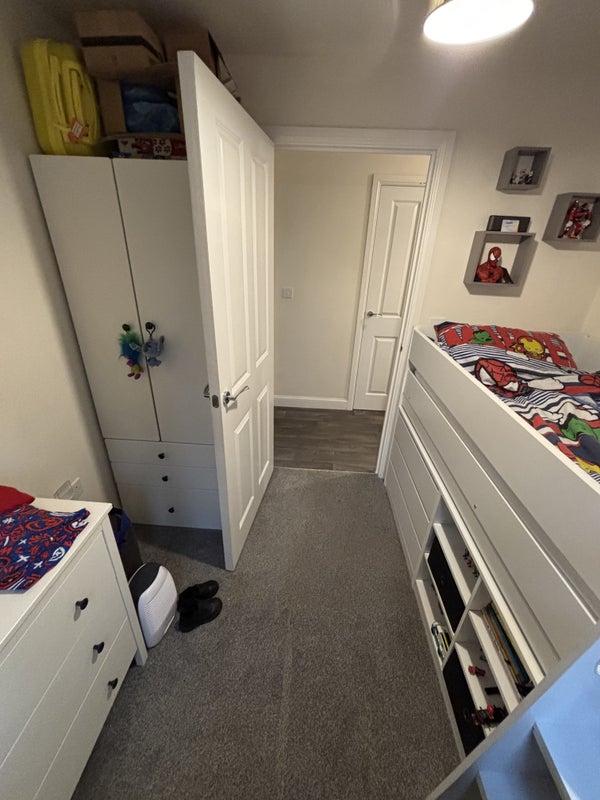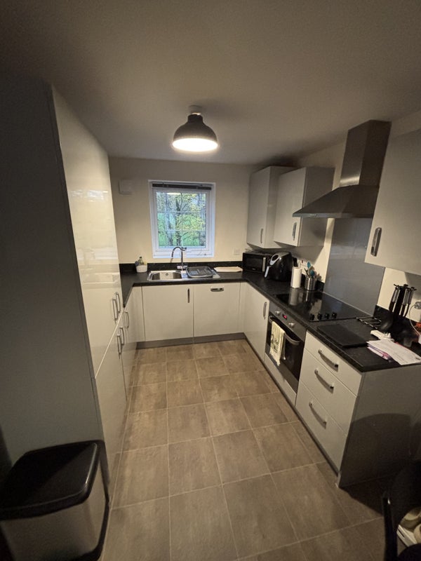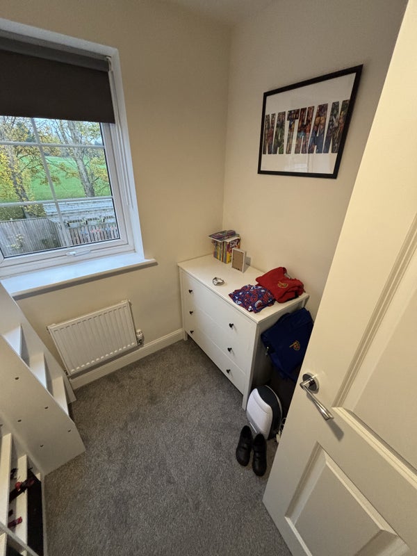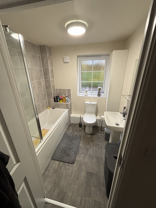 Flat has a toilet, another double room (mine and my son’s), a kitchen, living room, private car park with a free car bay for the new tenant. This state has its own little woods, big fields which belongs to the state. Also has a huge grass FA field behind my flat with access to the public.