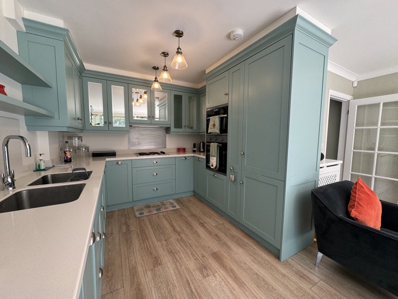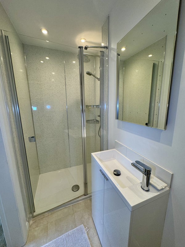 The ensuite double room itself forms part of a townhouse which is positioned by the banks of the River Bollin. Views from the room overlook the lawns which are well kept and can be used for sitting and relaxing. The bedroom is double size with quality furnishings, featuring a kingsize bed, comfy mattress, open storage, mirrors, tv and cabinet. The contemporary ensuite has a shower, toilet, sink and vanity unit with open shelving storage. Plus you get your own half of a walk in wardrobe and dressing area.