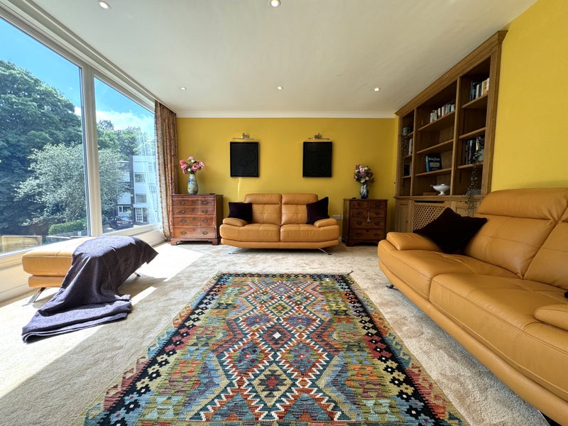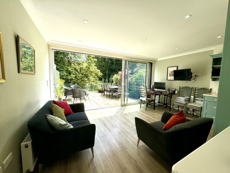 The lounge is on the same floor as the bedroom - designer sofas, footstool, large bookcase, large flat screen TV, huge glass windows overlooking the river Bollin and a beautiful conservation area