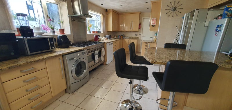 A large 6. 4m x 4. 5m Kitchen with top-of-the-range appliances including an American style fridge freezer with ice maker, Gemstone Granite worktops, and a breakfast bar.