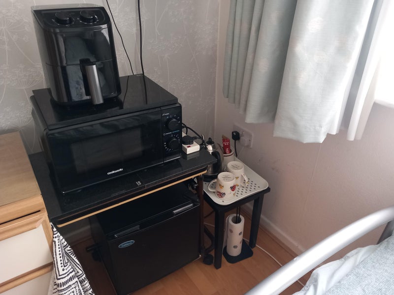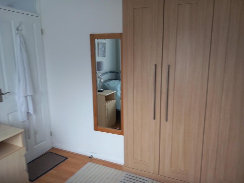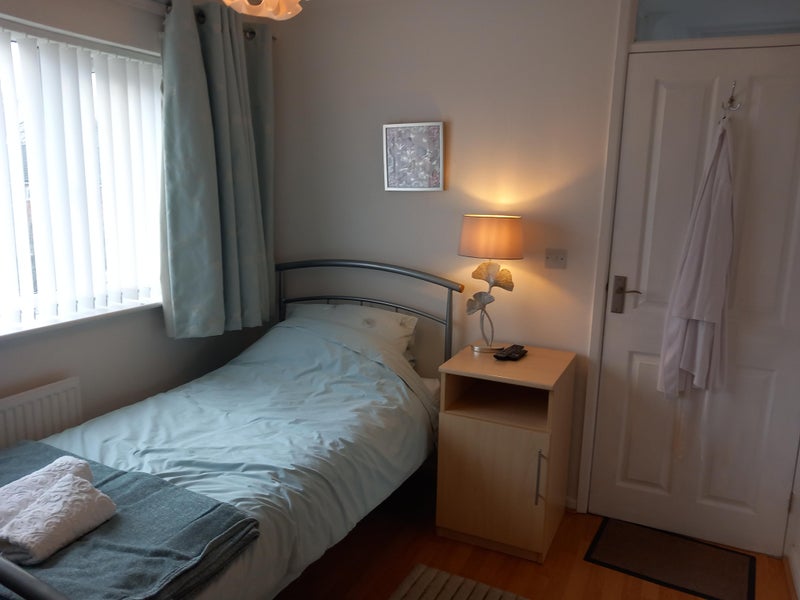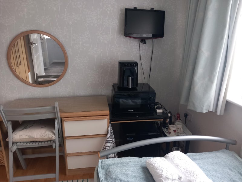 A single room with an adjacent shared bathroom (1 person). It has a single bed with a new mattress, bedside table, lamp, double wardrobe, dressing table and chair with internet and television. The room is most suitable for a female guest. There is a small fridge, microwave and airfryer for your convenience. Accsss to a washing machine and dishwasher is available in the downstairs kitchen, as well as access to an outside seating area in a sunny garden. Off road parking is on an adjoining driveway. It is located near Stockton Heath and conveniently situated for all main bus routes.