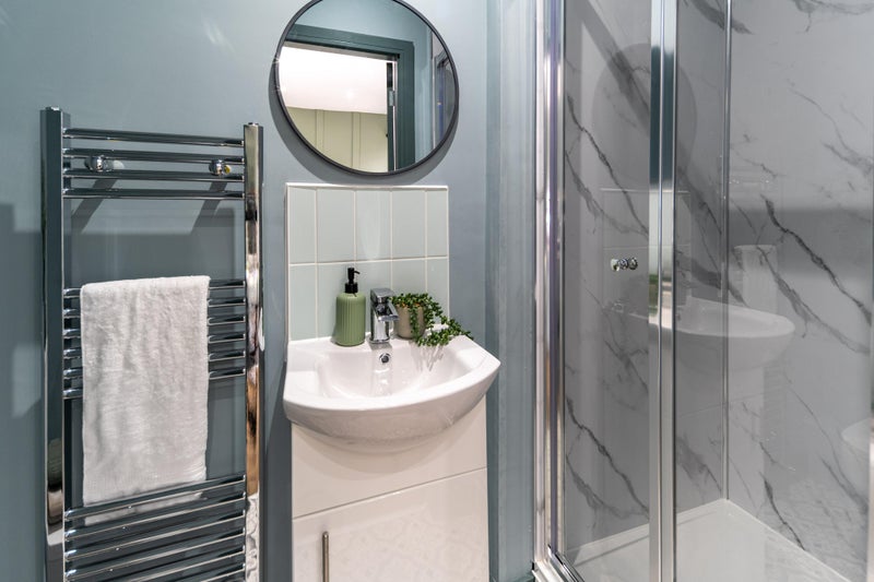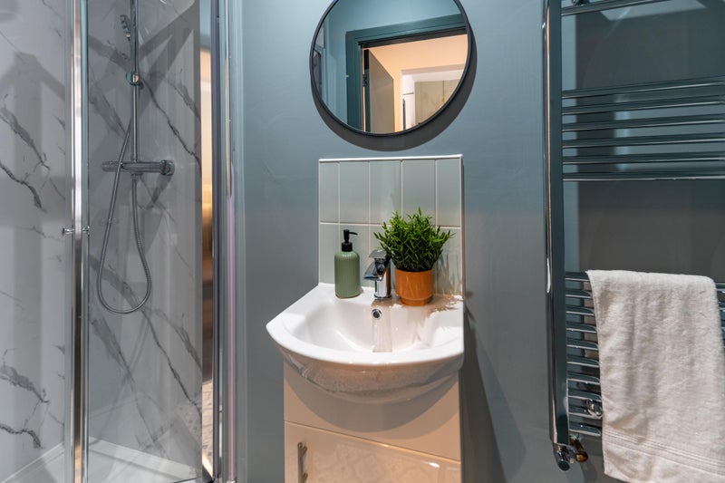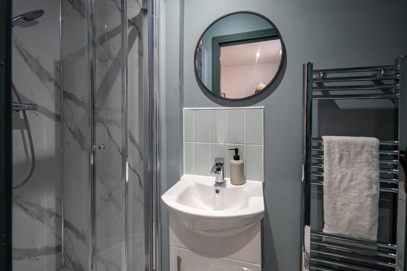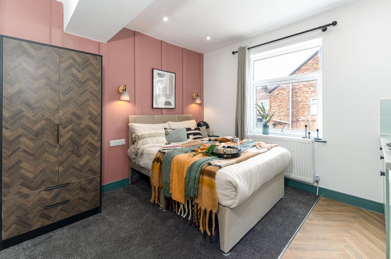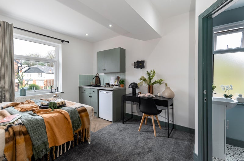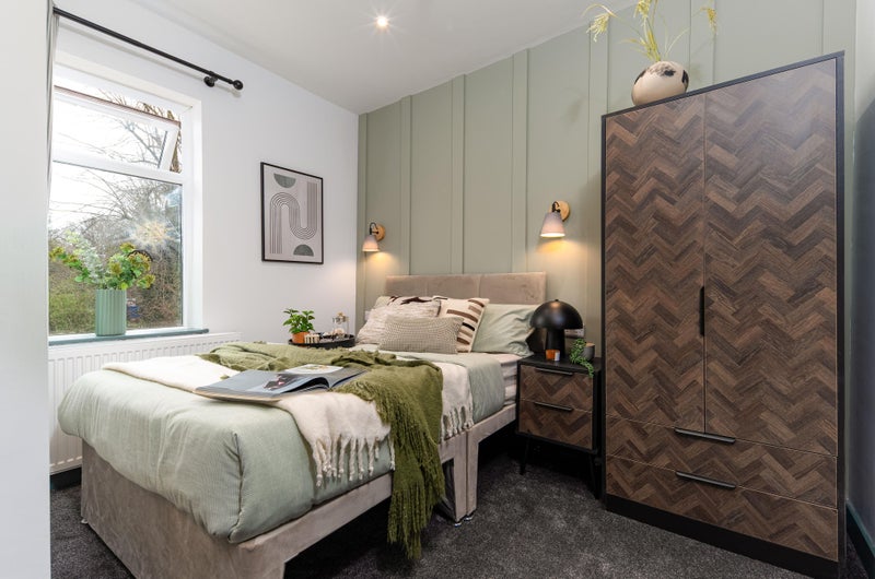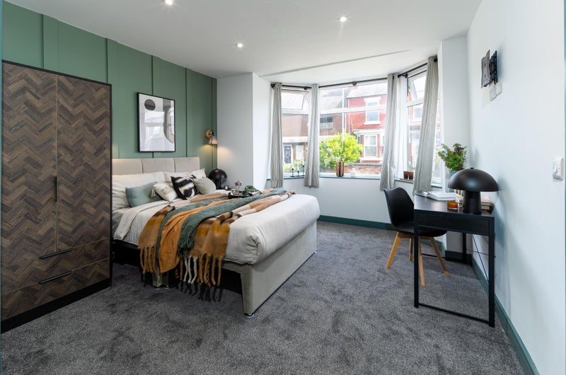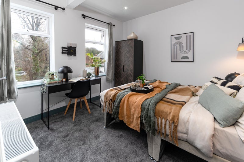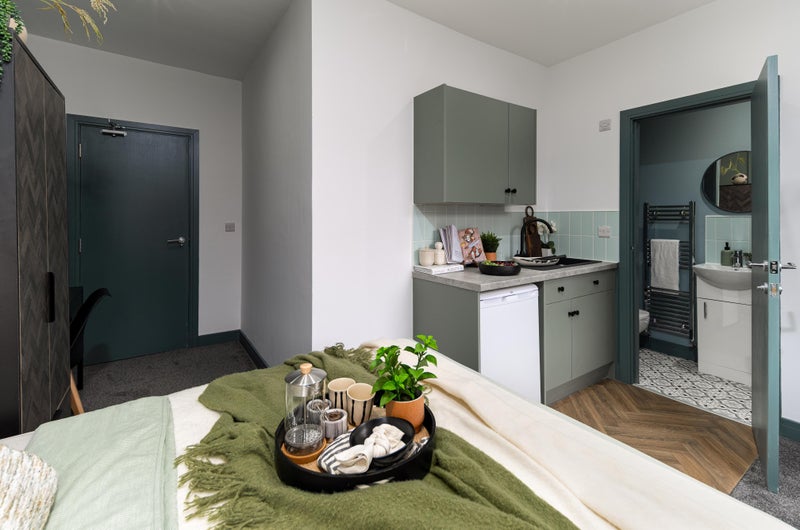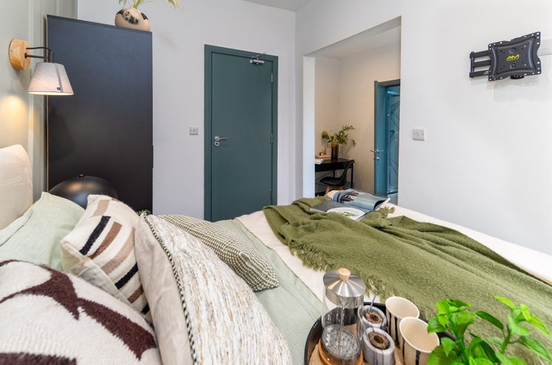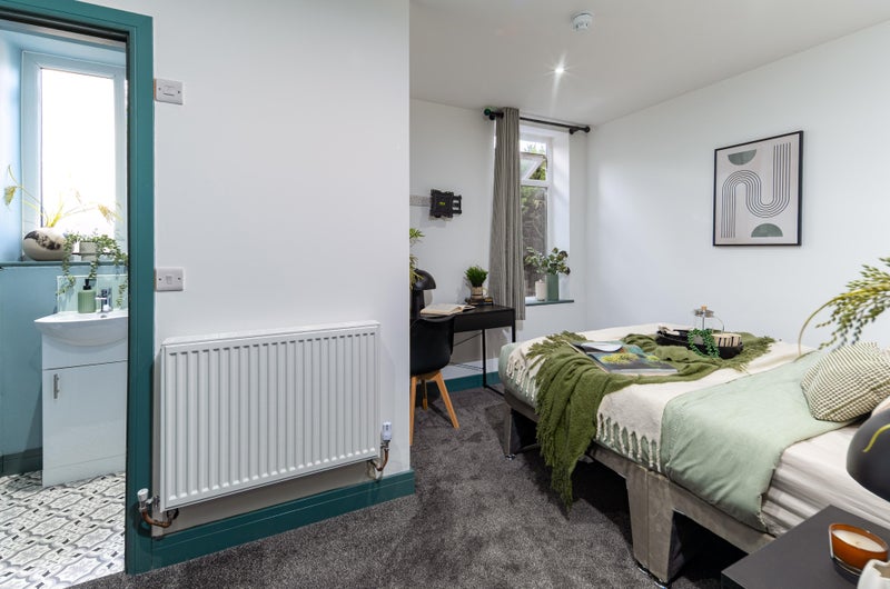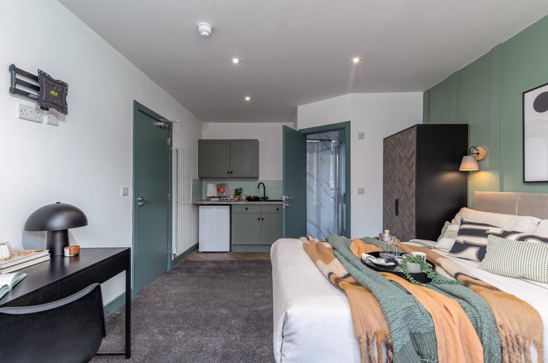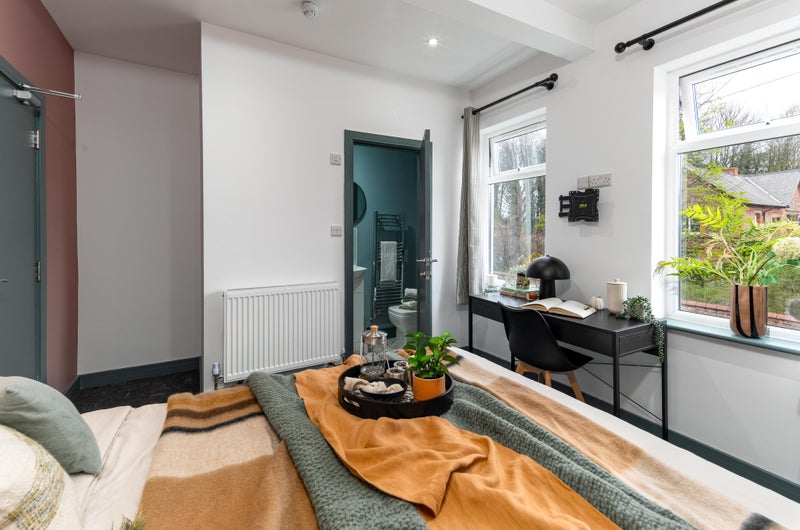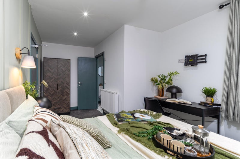 A bright, stylish space with a double bed, wardrobe, desk, and bedside table - everything you need to move in straight away. Bonus? Our rooms are acoustically treated, protecting your peace and quiet!