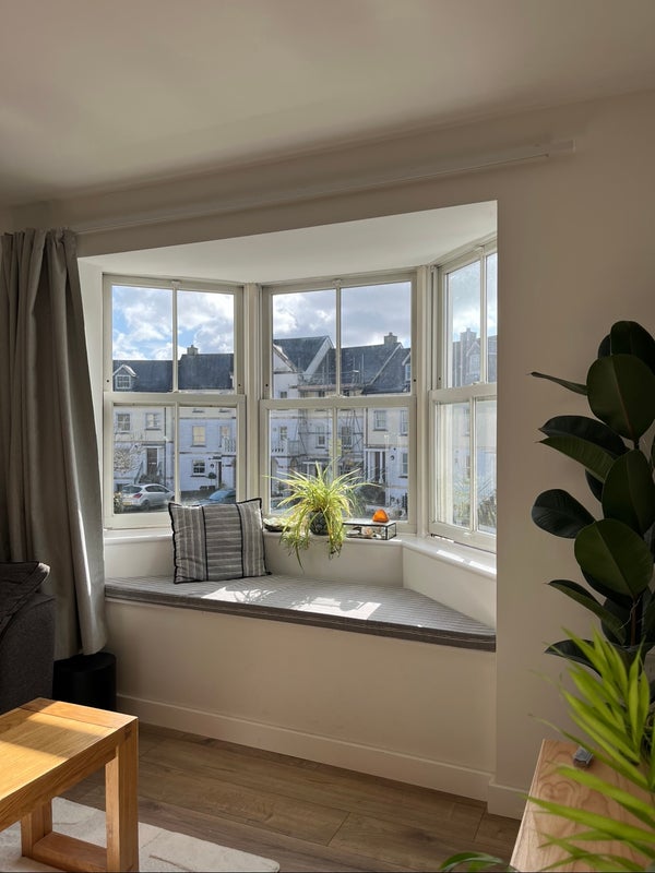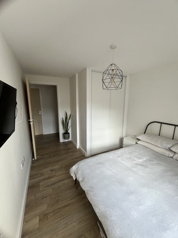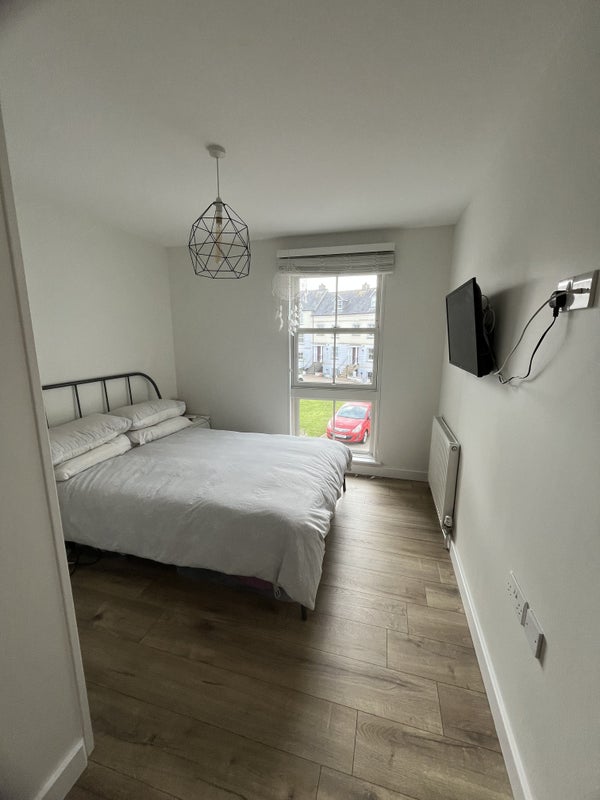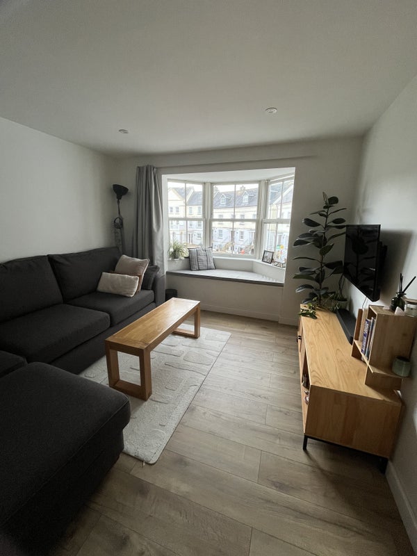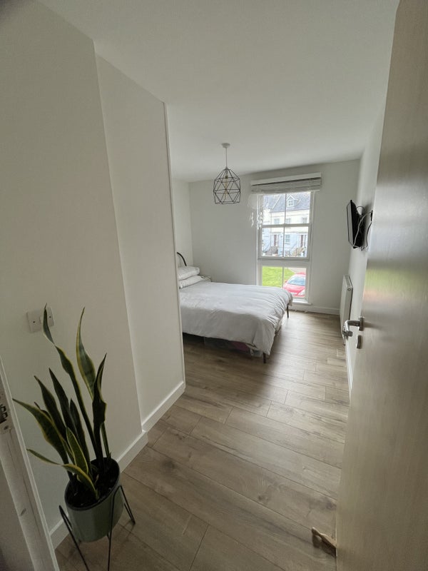 Bright and modern double room available in a well presented 2 bedroom flat in Bodmin. The flat is fully furnished to a high standard and includes a spacious living room with a bay window seating area, a comfortable sofa setup, and a smart TV. The kitchen comes fully equipped with all essential appliances and cookware, and the bathroom is clean and modern.