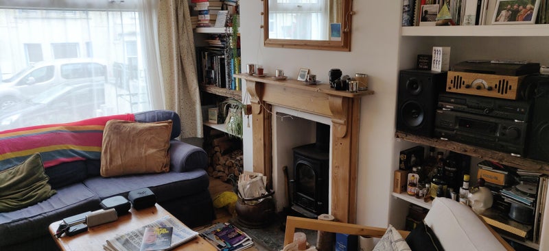 Living room and kitchen, wood burner, but no TV.