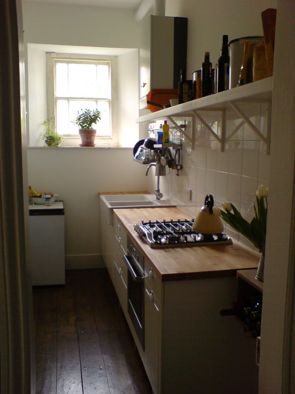 Galley kitchen with Bosch oven, gas hob, double sink, fridge freezer and washing machine. A small amount of basic crockery and cutlery can be provided if required.